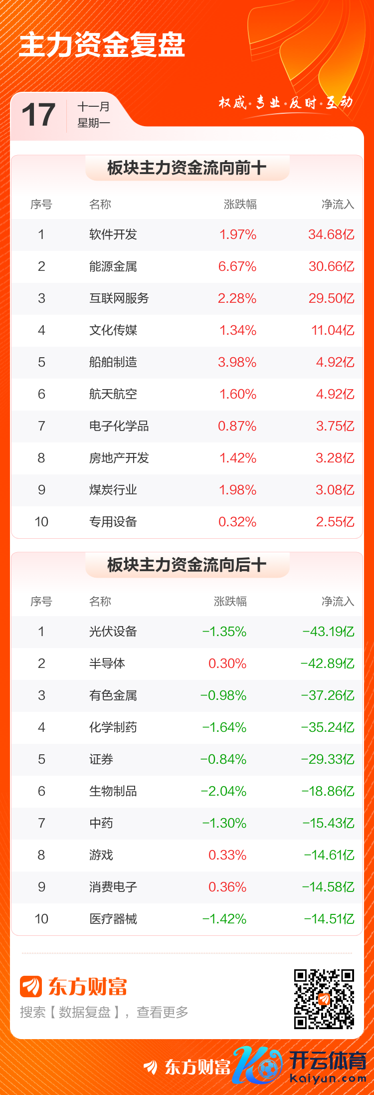 11月17日,沪指跌0.46%,深成指跌0.11%,创业板指跌0.2%。两市成交额1.91万亿,较上个来畴昔缩量473亿。数据露馅,本日大盘主力资金净流出396.40亿。软件教化、动力金属、互联网做事等板块主力资金流入排行居前,其中软件教化净流入34.68亿元。