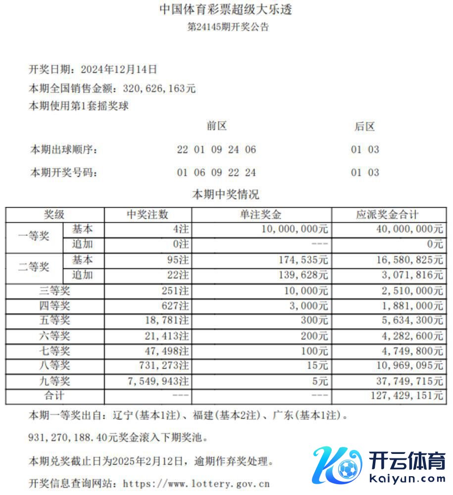 12月14日,体彩超等大乐透第24145期开奖。前区开出号码01、06、09、22、24;后区开出号码01、03。本期宇宙销售3.2亿元,为国度筹集彩票公益金1.15亿元。
