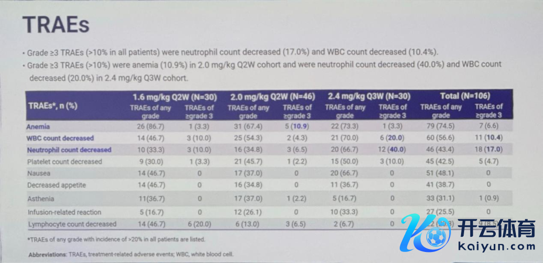 在安全性方面,三个剂量组离别有15例、16例和13例患者发生了≥3级调养关系不良事件(TRAE)。最常见的≥3级TRAE为中性粒细胞计数减少和白细胞计数减少。