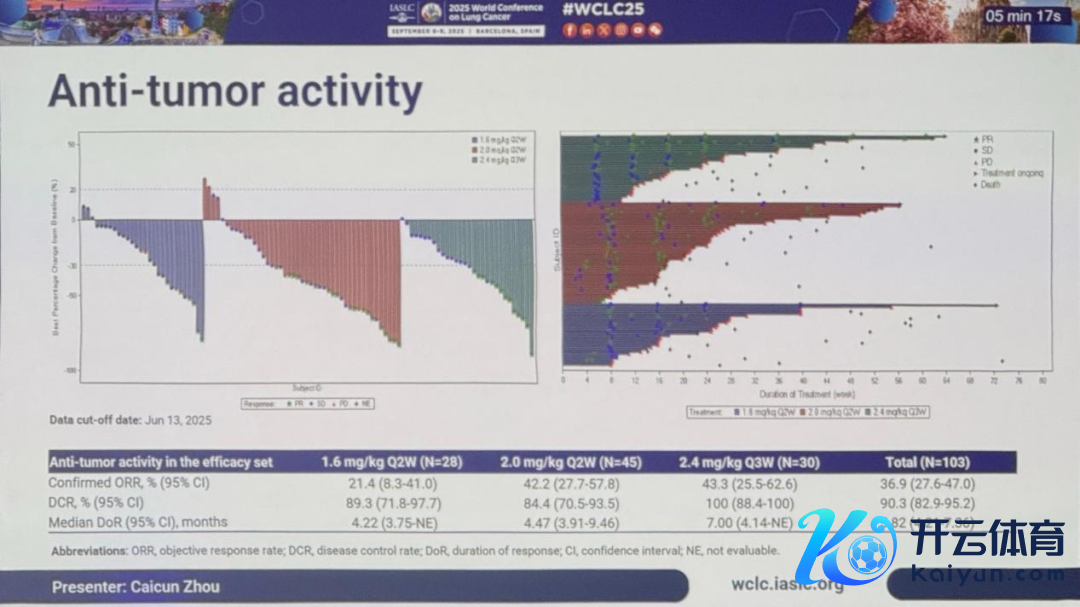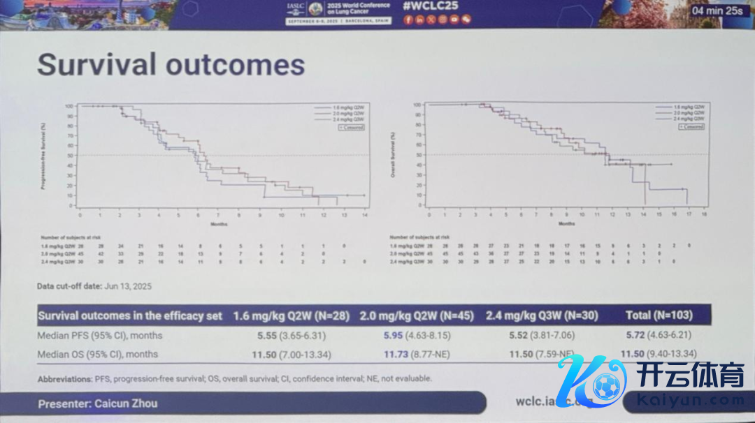 参谋浮现,1.6mg/kg Q2W、2.0mg/kg Q2W和2.4mg/kg Q3W三个剂量组证明的ORR离别为21.4%、42.2%、43.3%,DCR离别为89.3%、84.4%、100%,中位无发达糊口期(mPFS)离别为5.55个月、5.95个月和5.52个月,中位总糊口期(mOS)离别为11.50个月、11.73个月和11.50个月。