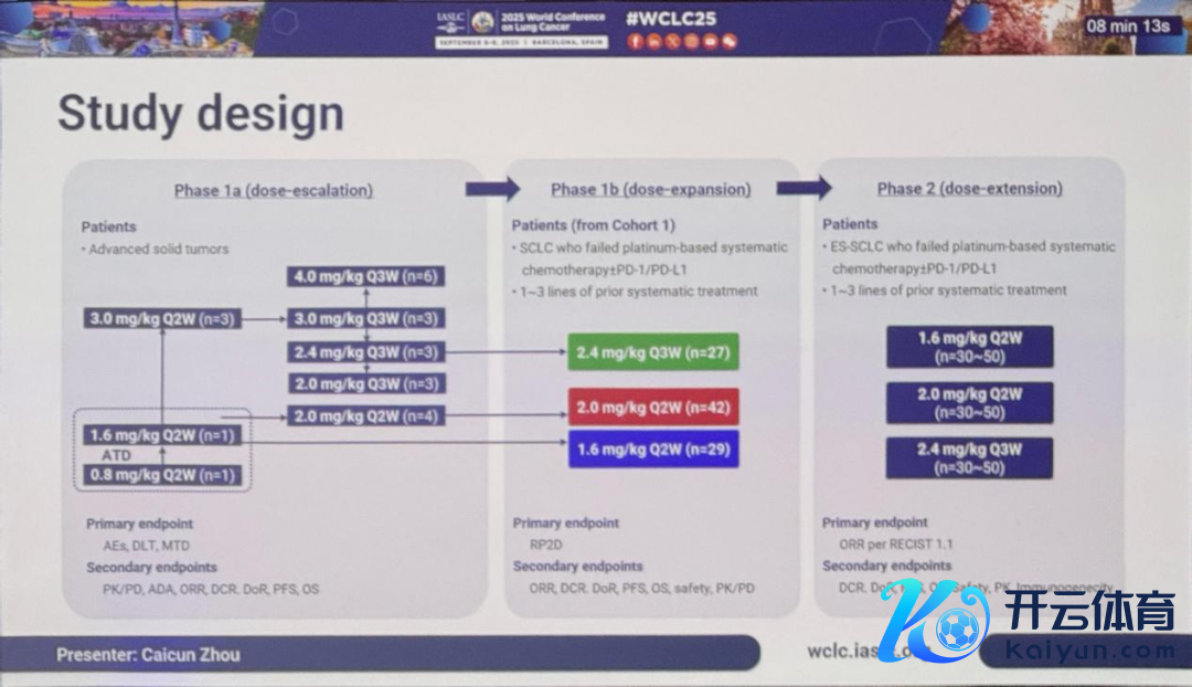 参谋贪图包括剂量递加期和剂量彭胀期。在剂量递加期,QLC5508通过静脉输注赐与,剂量范畴为0.8 mg/kg至4.0 mg/kg,给药拆开为每两周一次(Q2W)或每三周一次(Q3W)。在剂量彭胀期,入组患者为既往接受顺铂/铂类系统化疗±PD-1/PD-L1调养失败且既往调养线数不跨越三线,或无法耐受圭臬调养的ES-SCLC患者。剂量彭胀期采取的剂量为:1.6 mg/kg Q2W、2.0 mg/kg Q2W和2.4 mg/kg Q3W。
